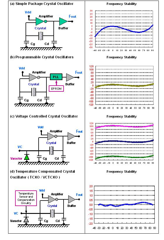 當(dāng)把石英共振子與振蕩線路或集成電路(IC)一起整合在一個(gè)封裝內(nèi), 由外部提供電源電壓, 形成一個(gè)主動(dòng)組件輸出頻率信號(hào), 就是所謂的石英晶體振蕩器. 石英晶體振蕩器可以藉由單一封裝組件內(nèi)部不同的振蕩線路及輸出線路, 提供不同特性需求的參考頻率(reference frequency). 例如有 石英頻率振蕩器SPXO ( Simple Package Crystal Oscillator ) 或稱為 CXO ( Clock Crystal Oscillator ), 可程序化石英晶體振蕩器PCXO ( Programmable Crystal Oscillator ), 電壓控制石英晶體振蕩器VCXO ( Voltage Controlled Crystal Oscillator ), 溫度補(bǔ)償石英晶體振蕩器TCXO ( Temperature Compensated Crystal Oscillator ) 及 恒溫槽控制石英晶體振蕩器OCXO ( Oven Controlled Crystal Oscillator ).