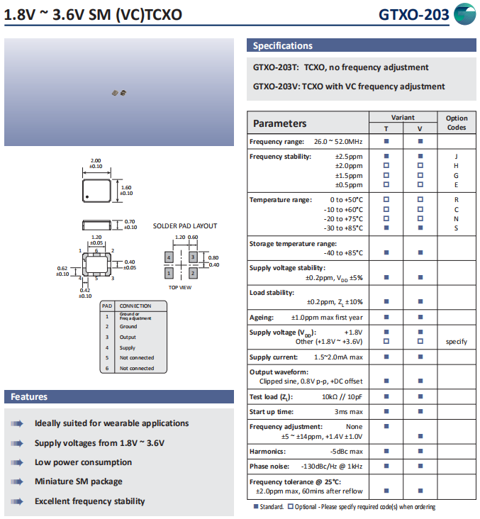 Golledge晶振,GTXO-203晶振,TCXO振蕩器.為對應低電源電壓的產(chǎn)品.(DC+1.8V±0.1V to +2.9V±0.1V對應IC可能) 高度:高0.8 mm,體積:0.0022 cm3,重量:0.008 g,小型,輕型,低消耗電流,表面貼片型產(chǎn)品.(可對應回流焊)無鉛產(chǎn)品.滿足無鉛焊盤的高溫回流溫度曲線要求,帶有AFC(頻率控制)功能,Enable/Disable功能,產(chǎn)品本身可根據(jù)使用需要進行選擇.